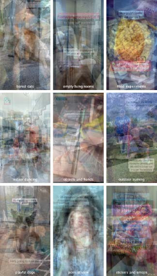 The second technique of stacking video frames into new visual artifacts foregrounds the background and captures movement. A video stack first requires a collection of distinct static frames extracted from a video. It then re-stacks selected frames in a specific order by superimposing images one upon another, retaining the videos’ temporality. It then applies different projection methods within the stack to blur or transfigure the pixels within a selection of frames (Ferguson 2017). The resulting analytical device operates via indistinction between the fore- and the background. Stable materials (such as home settings and video stickers) remain distinct, while dynamic entities (faces and bodies) become blurry visual projections. In the process, the videos transform into an abstract visual field, enabling the mapping of expressive traces within a collapsed aesthetic framework.