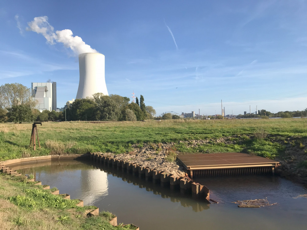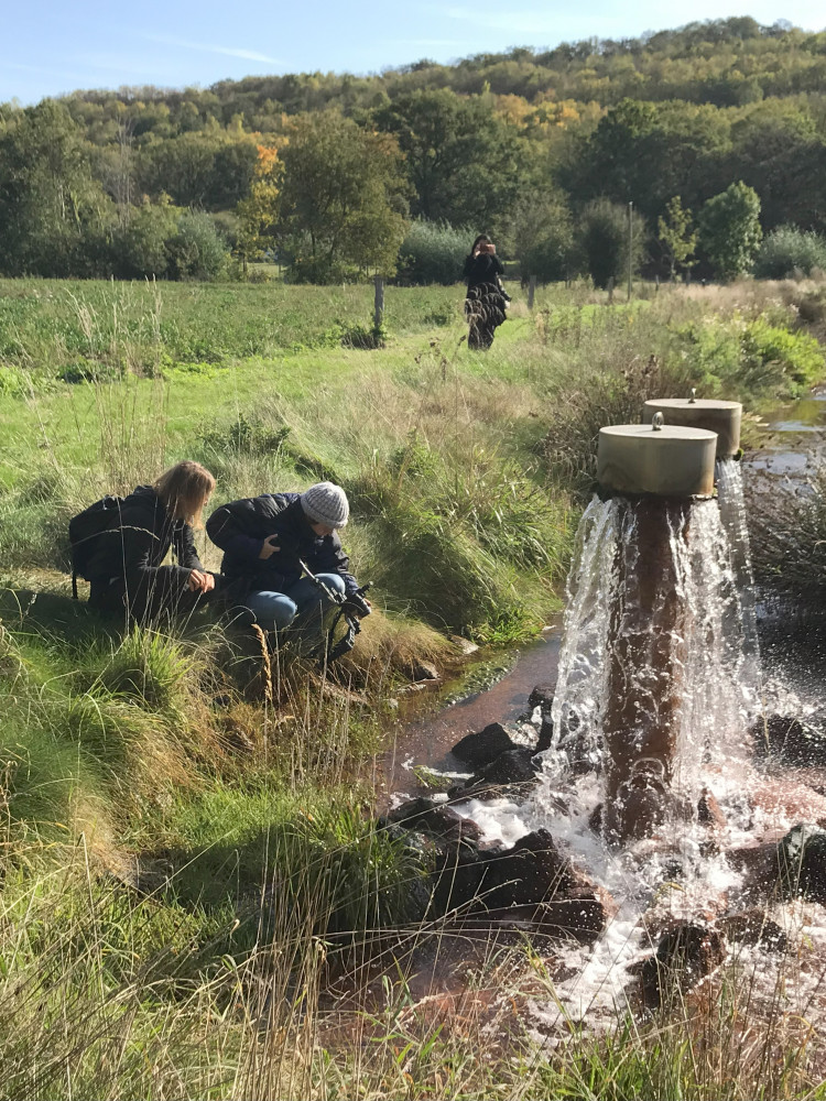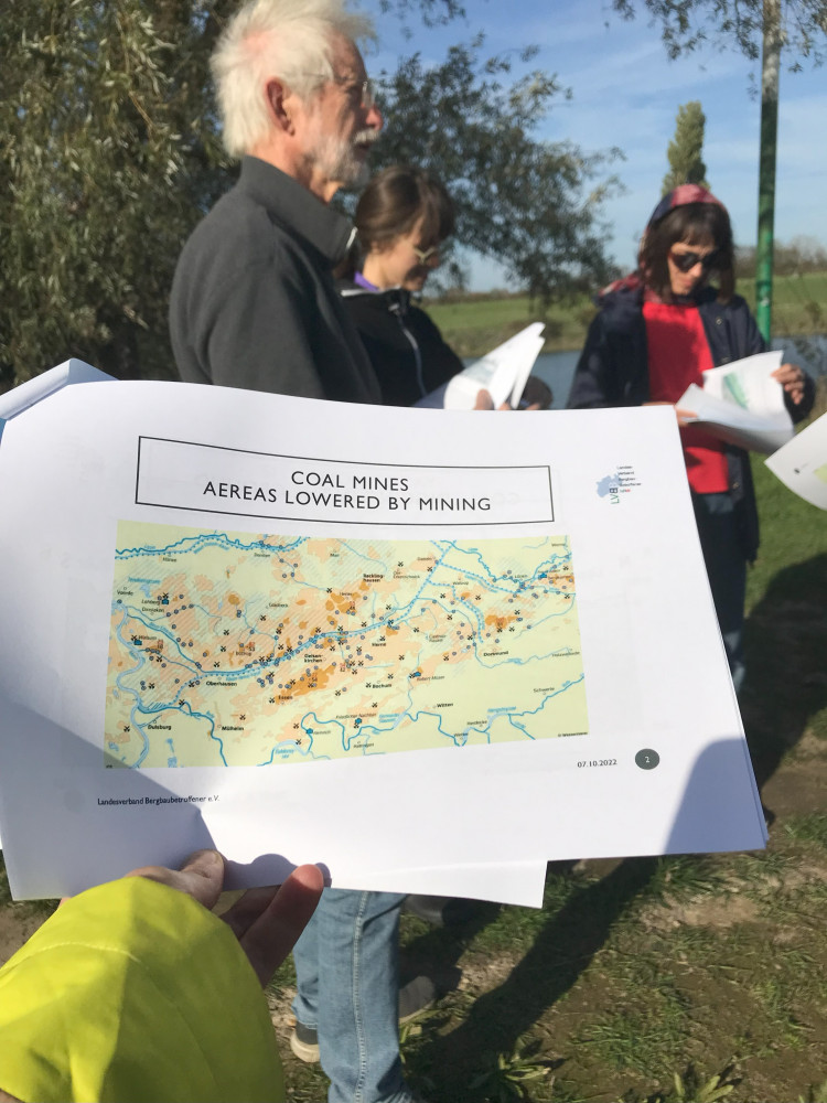 ↗ Zunächst gab uns Dr. Bastian Reker vom Forschungszentrum Nachbergbau der Technischen Hochschule Georg Agricola eine technische Einführung in die Grubenwasserhaltung. An der Halde Norddeutschland trafen wir den Leiter der Öffentlichkeitsarbeit der Linksniederrheinische Entwässerungs-Genossenschaft (LINEG) Ingo Plaschke, sowie die Geschäftsbereichsleiterin Wasserwirtschaft, Gesa Amstutz. Hier wird saures Haldenwasser in einer Freiluftanlage natürlich aufbereitet. Wir besichtigten Pumpanlagen, die verhindern, dass Wasserläufe ihre Fließrichtung ändern, als Teil der sogenannten Poldermaßnahmen. Zudem besuchten wir Stellen, an denen das Grubenwasser, das sich in den ehemaligen Steinkohleminen sammelt, heraus gepumpt und in den Rhein eingeleitet wird. Ulrich Behrens vom Landesverband Bergbaubetroffener NRW e. V. erklärte an der Grubenwassereinleitstelle in Walsum-Orsoy, welche Probleme die ungefilterte Grubenwasserentsorgung in den Rhein mit sich bringt. Und zuletzt verbrachten wir einen Nachmittag im Rheinland und besuchten den Tagebau Hambach, aus dessen Sümpfungswasser viele Gewässer in der Umgebung gespeist werden, wie beispielsweise der künstliche Tagebaurestsee «Peringsmaar«, die Erft und der Gillbach. ↙ Es folgten Online-Vorträge, interne Arbeitstreffen und eine gemeinsam konzipierte Ausstellung im März 2023, die neue künstlerische Arbeiten inspiriert von den Erfahrungen im Feld zeigte.
