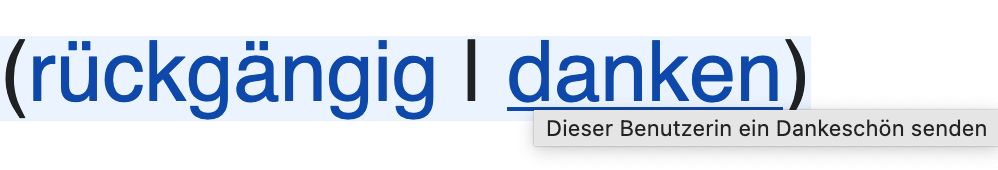 Die Arbeit in der Wikipedia muss keine ungesehene bleiben. Gehe auf einen Artikel deiner Wahl und klicke auf den Reiter »Versionsgeschichte« oben rechts. Jede Änderung des Artikels, egal ob nur ein Komma gelöscht oder ein ganzer Abschnitt hinzugefügt wurde, ist hier aufgelistet. Neben Datum, Uhrzeit und der Anzahl geänderter Bytes gibt es hier auch einen Link, mit dem du der Person danken kannst, die die Änderungen vorgenommen hat. Benutze den Danke-Button als Zeichen deiner Anerkennung.