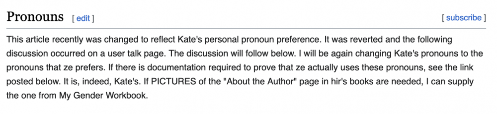 Von den Artikeln der Wikipedia nehmen viele an, dass sie in Konsens entstanden oder dass sie „objektiv“ geschrieben sind. Oft sind sich die verschiedenen Editor:innen jedoch gar nicht einig. Ausgefochten werden diese Konflikte auf den Diskussionsseiten. Dorthin gelangt ihr, wenn ihr auf den Reiter »Diskussion« links über dem Artikel klickt. Zum Teil wird dort sehr ausführlich und lange debattiert. Diese Kontroversen finden jedoch im Hintergrund statt und viele Leser:innen wissen nichts davon. Die Medienwissenschaftler Matthew Vetter und Keon Pettiway haben folgenden Umgang vorgeschlagen (2017): Indem Diskussionen im Artikel selbst ein Abschnitt gewidmet wird, kann Dissens sichtbarer gemacht werden. Wird also im Hintergrund eines biografischen Artikels über das Pronomen oder die Anrede einer Person gestritten, kann darauf mit einem Abschnitt namens »Kontroverse zu Pronomen« und einer Zusammenfassung der Streitpunkte auf der Artikelseite hingewiesen werden. Auf diese Art und Weise könnt ihr Konflikte hervorheben, die auf den Diskussionsseiten der Artikel »versteckt« werden.